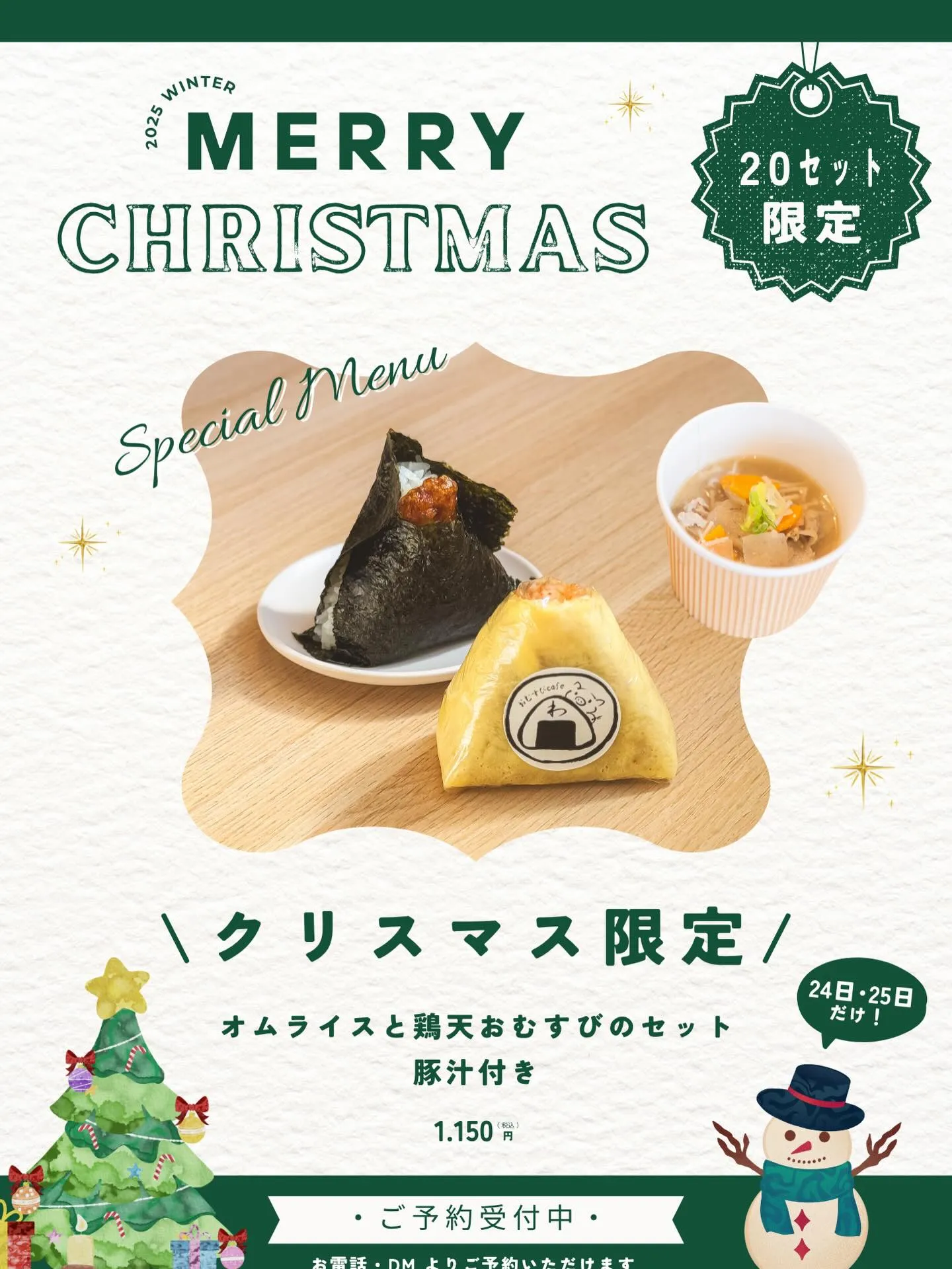 🎄クリスマス限定🎄 2025/11/21 🎄クリスマス限定🎄 12月24日、25日限定で販売致します! オムライスと鶏天おむすびのセット 豚汁付きになります🍙 両日20セット限定です! お電話やDMよりご予約いただけます。 たくさんのご予約お待ちしております😊